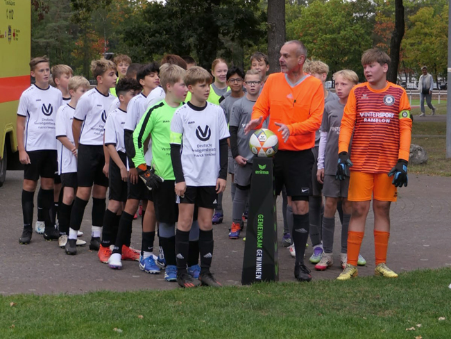 U13 Mannschaften den neuen Spielball vor Beginn der Partei