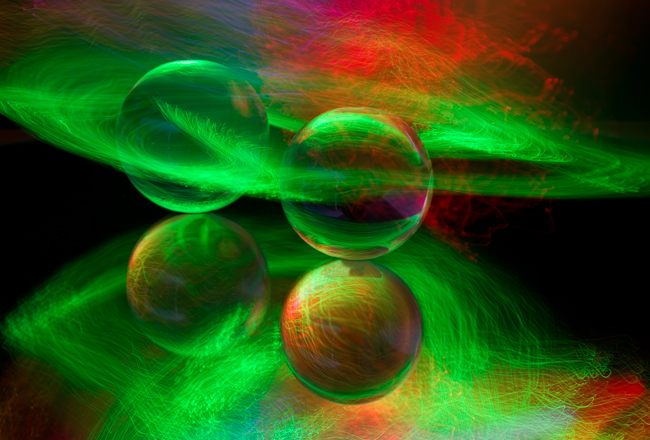 Sich spiegelnde Glaskugeln von farbigen Lichtspuren einer Glasfaserlampe umspielt – fast so schön wie Nordlichter.